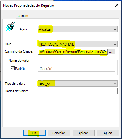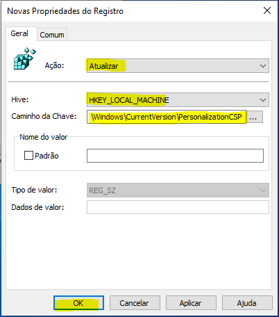 - Caminho da chave: SOFTWARE\Microsoft\Windows\CurrentVersion\PersonalizationCSP
