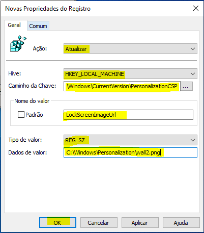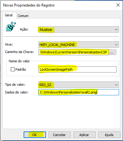- Nome do valor: LockScreenImagePath