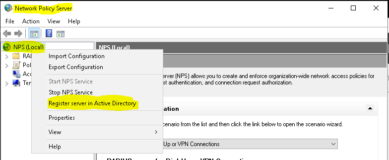 • Na janela “Servidor de politica de rede” Clicar com o botão direito em: “NPS (Local)“ e escolher a opção: “Registrar servidor no Active Directory”