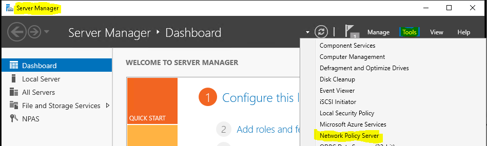 • Gerenciador de servidor » Ferramentas » Servidor de política de rede