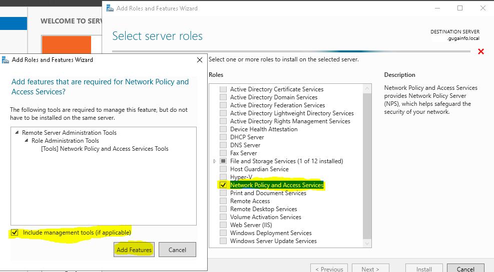 Selecionar a função: “Network Policy and Access Services” Irá aparecer uma Janela para adicionar recursos que são necessários para o NPAS. Deixe marcado a opção: “Incluir ferramentas de gerenciamento (se aplicável)“